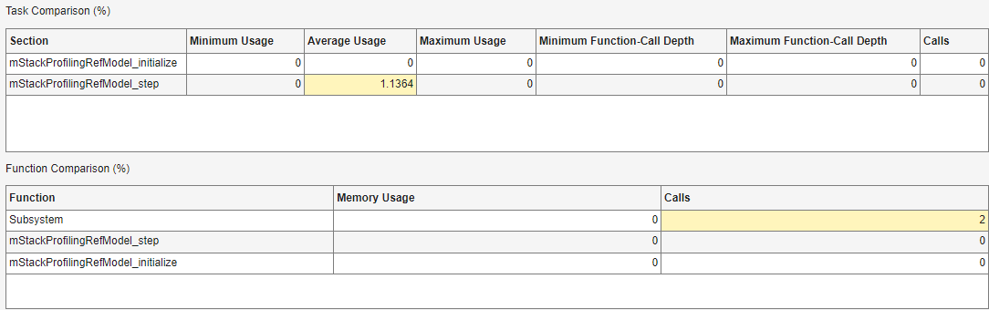 Function Comparison — A percentage comparison of function stack usage values for the two simulations. You also see a comparison for the number of calls to each function.