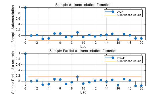 Figure contains 2 axes objects. Axes object 1 with title Sample Autocorrelation Function, xlabel Lag, ylabel Sample Autocorrelation contains 4 objects of type stem, line, constantline. These objects represent ACF, Confidence Bound. Axes object 2 with title Sample Partial Autocorrelation Function, xlabel Lag, ylabel Sample Partial Autocorrelation contains 4 objects of type stem, line, constantline. These objects represent PACF, Confidence Bound.