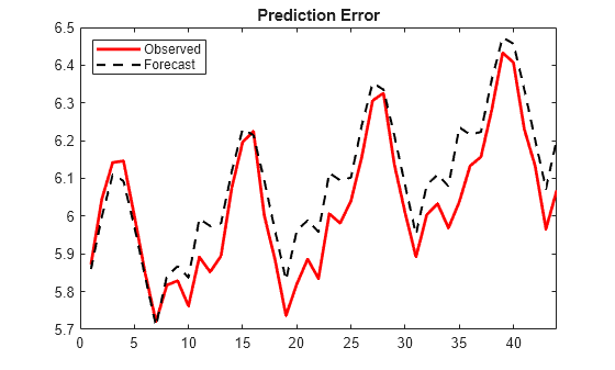 Figure contains an axes object. The axes object with title Prediction Error contains 2 objects of type line. These objects represent Observed, Forecast.