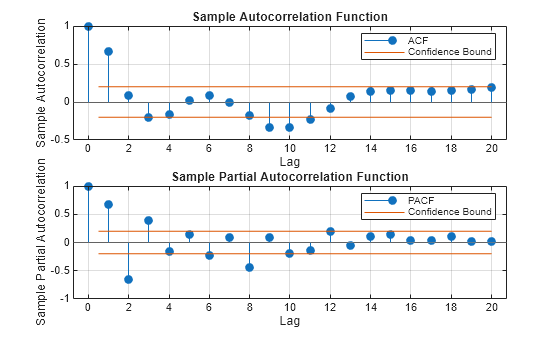 figure subplot(2,1,1) autocorr(Y) subplot(2,1,2) parcorr(Y)
