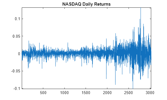 load Data_EquityIdx ReturnsTbl = price2ret(DataTable); T = height(ReturnsTbl); figure plot(ReturnsTbl.NASDAQ) axis tight title("NASDAQ Daily Returns")