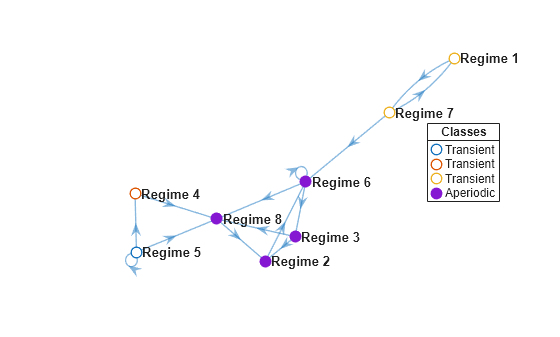 Plot a digraph of the Markov chain mc. Display the transition probabilities.