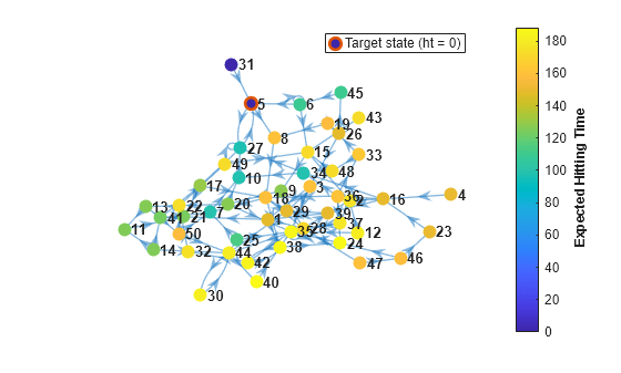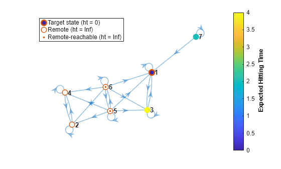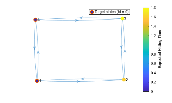 Compute the expected first hitting times for state 1, beginning from each state in the Markov chain mc. Also, plot a digraph and specify node colors representing the expected first hitting times for state 1.