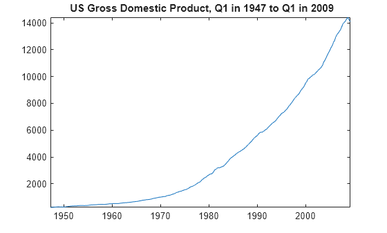 load Data_USEconModel gdp = DataTimeTable.GDP; cpi = DataTimeTable.CPIAUCSL; figure plot(DataTimeTable.Time,gdp) title("{\bf US Gross Domestic Product, Q1 in 1947 to Q1 in 2009}") axis tight