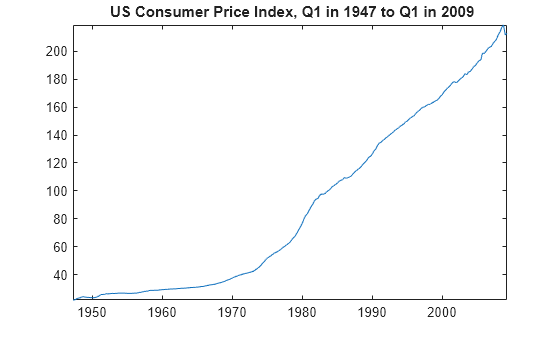 figure plot(DataTimeTable.Time,cpi) title("{\bf US Consumer Price Index, Q1 in 1947 to Q1 in 2009}") axis tight