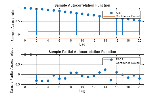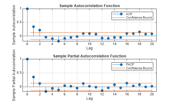 figure tiledlayout(2,1) nexttile autocorr(u) nexttile parcorr(u)