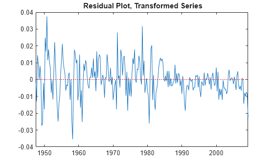 dlGDP = diff(log(gdp)); dlCPI = diff(log(cpi)); dlXDes = [ones(length(dlCPI),1) dlCPI]; beta = dlXDes\dlGDP; u = dlGDP - dlXDes*beta; figure plot(DataTimeTable.Time(2:end),u); h2 = gca; hold on plot(h2.XLim,[0 0],"r:") title("{\bf Residual Plot, Transformed Series}") hold off