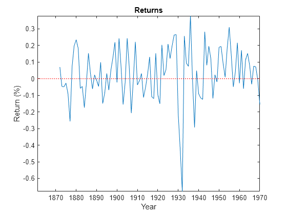Figure contains an axes object. The axes object with title Returns, xlabel Year, ylabel Return (%) contains 2 objects of type line.