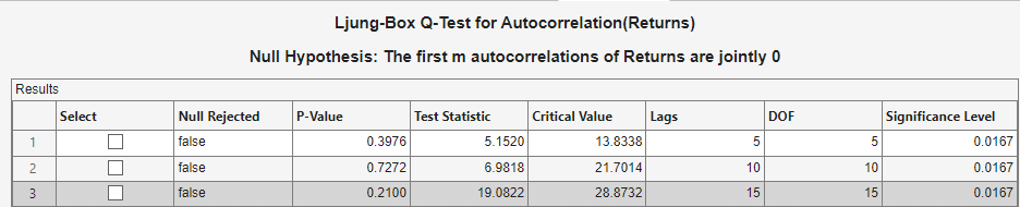 Conduct the Ljung-Box Q-test to assess whether there is significant serial correlation in the returns for at most 5, 10, and 15 lags. To maintain a false-discovery rate of approximately 0.05, specify a significance level of 0.05/3 = 0.0167 for each test.