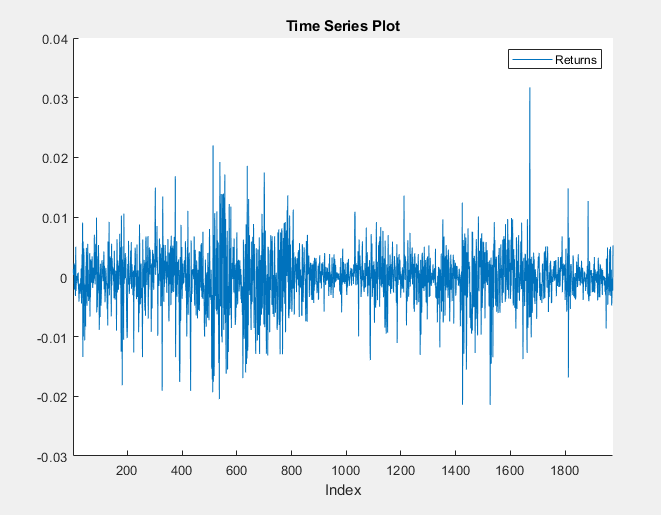 The returns series fluctuates around a common level, but exhibits volatility clustering. Large changes in the returns tend to cluster together, and small changes tend to cluster together. That is, the series exhibits conditional heteroscedasticity.