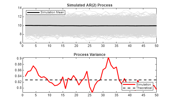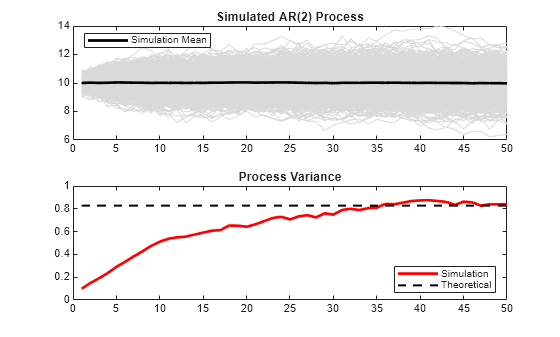 Y = simulate(Mdl,50,'NumPaths',1000); figure subplot(2,1,1) plot(Y,'Color',[.85,.85,.85]) title('Simulated AR(2) Process') hold on h = plot(mean(Y,2),'k','LineWidth',2); legend(h,'Simulation Mean','Location','NorthWest') hold off subplot(2,1,2) plot(var(Y,0,2),'r','LineWidth',2) title('Process Variance') hold on plot(1:50,sigma2*ones(50,1),'k--','LineWidth',1.5) legend('Simulation','Theoretical',... 'Location','SouthEast') hold off