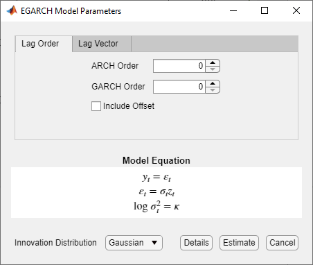 As you adjust parameter values, the equation in the Model Equation section changes to match your specifications. Adjustable parameters correspond to input and name-value pair arguments described in the previous sections and in the egarch reference page.