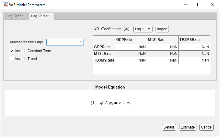 Specify Lag Structure Using Lag Vector Tab