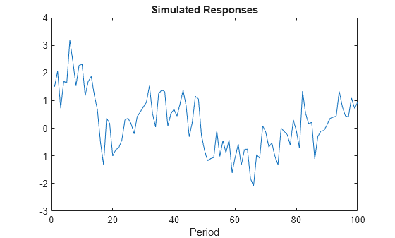 params = [0.75 0.5 0.25]; y = simulate(Mdl,100,'Params',params); figure; plot(y); title 'Simulated Responses'; xlabel 'Period';