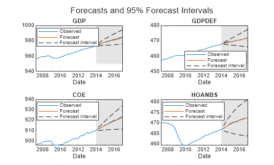 multivariate response forecasts Y = forecast(Mdl,numperiods,Y0)Y over a length