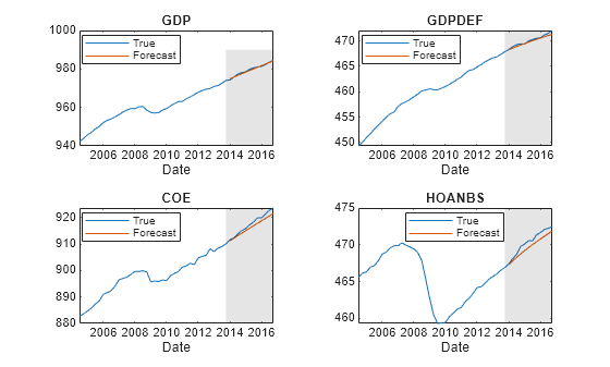 fh = dateshift(FRED.Time(end),"end","quarter",1:12); figure; tiledlayout(2,2) nexttile h1 = plot(FRED.Time((end-49):end),FRED.GDP((end-49):end)); hold on h2 = plot(fh,Y(:,1)); title("Gross Domestic Product"); ylabel("Index (scaled)"); xlabel("Date"); h = gca; fill([FRED.Time(end) fh([end end]) FRED.Time(end)],h.YLim([1 1 2 2]),"k", ... FaceAlpha=0.1,EdgeColor="none"); legend([h1 h2],"True","Forecast",Location="best") hold off nexttile h1 = plot(FRED.Time((end-49):end),FRED.GDPDEF((end-49):end)); hold on h2 = plot(fh,Y(:,2)); title("GDP Deflator"); ylabel("Index (scaled)"); xlabel("Date"); h = gca; fill([FRED.Time(end) fh([end end]) FRED.Time(end)],h.YLim([1 1 2 2]),"k", ... FaceAlpha=0.1,EdgeColor="none"); legend([h1 h2],"True","Forecast",Location="best") hold off nexttile h1 = plot(FRED.Time((end-49):end),FRED.COE((end-49):end)); hold on h2 = plot(fh,Y(:,3)); title("Paid Compensation of Employees"); ylabel("Billions of $ (scaled)"); xlabel("Date"); h = gca; fill([FRED.Time(end) fh([end end]) FRED.Time(end)],h.YLim([1 1 2 2]),"k", ... FaceAlpha=0.1,EdgeColor="none"); legend([h1 h2],"True","Forecast",Location="best") hold off nexttile h1 = plot(FRED.Time((end-49):end),FRED.HOANBS((end-49):end)); hold on h2 = plot(fh,Y(:,4)); title("Nonfarm Business Sector Hours"); ylabel("Index (scaled)"); xlabel("Date"); h = gca; fill([FRED.Time(end) fh([end end]) FRED.Time(end)],h.YLim([1 1 2 2]),"k", ... FaceAlpha=0.1,EdgeColor="none"); legend([h1 h2],"True","Forecast",Location="best") hold off
