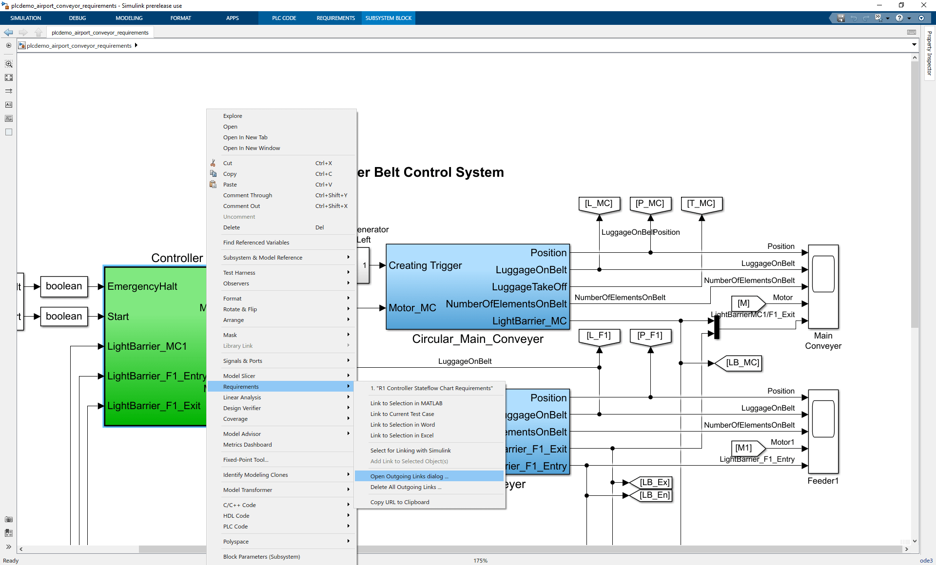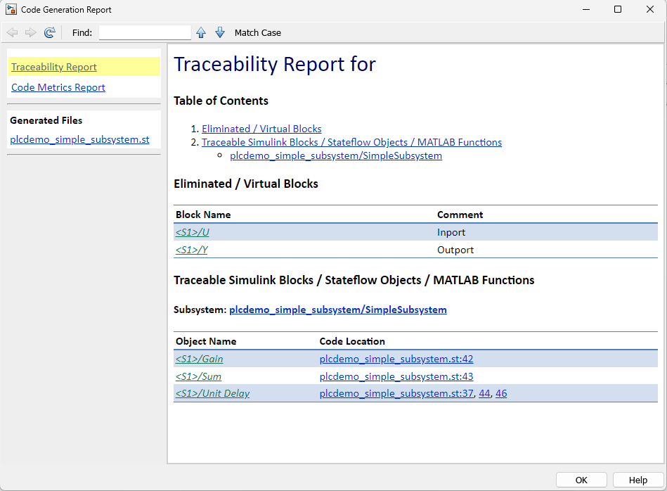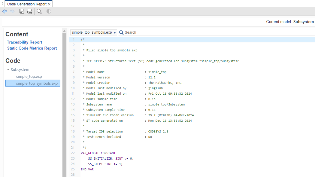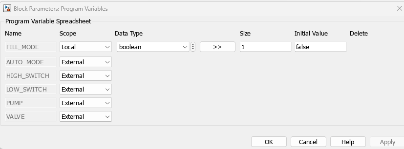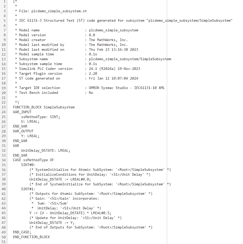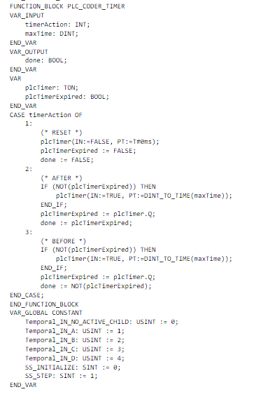 AirportConveyorBeltControlSystemExample_01.png GenerateBusVariablesAsStructuresInStructuredTextCodeExample_01.png GenerateOptimizedSTCodeByFoldingExpressionsExample_01.png GenerateOptimizedSTCodeByFoldingExpressionsExample_02.png GenerateSTCodeByUsingACustomSupportedFunctionListExample_01.png GenerateSTCodeByUsingACustomSupportedFunctionListExample_02.png GenerateSTCodeForAMultirateSimulinkSubsystemExample_01.png GenerateSTCodeForAMultirateSimulinkSubsystemExample_02.png GenerateSTCodeForAStateflowChartWithAbsTimeTemporalLogicExample_01.png GenerateSTCodeForAStateflowChartWithAbsTimeTemporalLogicExample_02.png GenerateSTCodeForHierarchicalSimulinkSubsystemsExample_01.png GenerateSTCodeForSimulinkModelWithFixedPointDataTypesExample_01.png GenerateSTCodeForVirtualHierarchicalSubsystemsExample_01.png GenerateSTCodeForVirtualHierarchicalSubsystemsExample_02.png GenerateStructuredTextCodeForAMATLABFunctionBlockExample_01.png GenerateStructuredTextCodeForAMATLABFunctionBlockExample_02.png GenerateStructuredTextCodeForASimpleSimulinkRSubsystemExample_01.png GenerateStructuredTextCodeForMappedTunableParametersExample_01.png GenerateStructuredTextCodeForMappedTunableParametersExample_02.png GenerateStructuredTextCodeForModelReferenceHierarchyExample_01.png GenerateStructuredTextCodeForModelReferenceHierarchyExample_02.png GenerateStructuredTextCodeForModelReferenceHierarchyExample_03.png GenerateStructuredTextCodeForModelReferenceHierarchyExample_04.png GenerateStructuredTextCodeForModelReferenceHierarchyExample_05.png GenerateStructuredTextCodeForModelReferenceHierarchyExample_06.png GenerateStructuredTextCodeForModelReferenceHierarchyExample_07.png GenerateStructuredTextCodeForReusableSubsystemsExample_01.png GenerateStructuredTextCodeForReusableSubsystemsExample_02.png GenerateStructuredTextCodeForSubsystemExample_01.png GenerateStructuredTextCodeForVarialbleSizeSignalsExample_01.png GenerateStructuredTextCodeForVarialbleSizeSignalsExample_02.png GenerateStructuredTextCodeForWidthBlockExample_01.png GenerateStructuredTextCodeForWidthBlockExample_02.png GenerateStructuredTextCodeFromForEachSubsystemsExample_01.png GenerateStructuredTextCodeFromForEachSubsystemsExample_02.png GenerateStructuredTextCodeWithVARINOUTVariablesExample_01.png GeneratingStructuredTextForAFeedforwardPIDControllerExample_01.png GeneratingStructuredTextForAFeedforwardPIDControllerExample_02.png ImportL5XLadderDiagramFilesIntoSimulinkExample_01.png ImportL5XLadderDiagramFilesIntoSimulinkExample_02.png ImportL5XLadderDiagramFilesIntoSimulinkExample_03.png ImportL5XLadderDiagramFilesIntoSimulinkExample_04.png ImportL5XLadderDiagramFilesIntoSimulinkExample_05.png IncludePortsAndBusElementDescriptionsInGeneratedCodeExample_01.png IncludePortsAndBusElementDescriptionsInGeneratedCodeExample_02.png IncludePortsAndBusElementDescriptionsInGeneratedCodeExample_03.png IncludePortsAndBusElementDescriptionsInGeneratedCodeExample_04.png IncludePortsAndBusElementDescriptionsInGeneratedCodeExample_05.png IntegrateUserDefinedFBsDataTypesAndGlobalVarsIntoSTExample_01.png ModelAndGenerateCodeForJMPandLBLadderDiagramInstructionsExample_01.png ModelAndGenerateCodeForJMPandLBLadderDiagramInstructionsExample_02.png ModelAndGenerateCodeForJMPandLBLadderDiagramInstructionsExample_03.png ModelAndGenerateCodeForJMPandLBLadderDiagramInstructionsExample_04.png ModelAndGenerateCodeForJMPandLBLadderDiagramInstructionsExample_05.png ModelAndGenerateSTCodeForStateMachineIndTankLvlCtrlExample_01.png ModelAndGenerateSTCodeForStateMachineIndTankLvlCtrlExample_02.png ModelAndGenerateSTCodeForStateMachineIndTankLvlCtrlExample_03.png ModelAndGenerateSTCodeForStateMachineIndTankLvlCtrlExample_04.png ModelAndGenerateSTCodeForStateMachineIndTankLvlCtrlExample_05.png ModelAndGenerateSTCodeForStateMachineIndTankLvlCtrlExample_06.png ModelAndGenerateSTCodeForStateMachineIndTankLvlCtrlExample_07.png ModelAndGenerateSTCodeForStateMachineIndTankLvlCtrlExample_08.png ModelAndSimulateALadderLogicBasedTemperatureControllerExample_01.png ModelAndSimulateALadderLogicBasedTemperatureControllerExample_02.png ModelAndSimulateALadderLogicBasedTemperatureControllerExample_03.png ModelAndSimulateLadderLogicBasedElevatorControllerExample_01.png ModelAndSimulateLadderLogicBasedElevatorControllerExample_02.png ModelAndSimulateLadderLogicBasedElevatorControllerExample_03.png ModelAndSimulateLadderLogicBasedElevatorControllerExample_04.png ModelSimAndGenLadderLogicForIndustrialTankLvlControlSysExample_01.png ModelSimAndGenLadderLogicForIndustrialTankLvlControlSysExample_02.png ModelSimAndGenLadderLogicForIndustrialTankLvlControlSysExample_03.png ModelSimAndGenLadderLogicForIndustrialTankLvlControlSysExample_04.png ModelSimAndGenLadderLogicForIndustrialTankLvlControlSysExample_05.png PreventExternalVarInitializationExample_01.png RunTimeDataCollectionByUsingExternalModeLoggingExample_01.png RunTimeDataCollectionByUsingExternalModeLoggingExample_02.png RunTimeDataCollectionByUsingExternalModeLoggingExample_03.png SimulateAndGenerateCodeForTimerBasedLadderLogicExample_01.png SimulateAndGenerateCodeForTimerBasedLadderLogicExample_02.png SimulateAndGenerateCodeForTimerBasedLadderLogicExample_03.png SimulateAndGenerateCodeForTimerBasedLadderLogicExample_04.png SimulateAndGenerateCodeForTimerBasedLadderLogicExample_05.png SimulateAndGenerateCodeForTimerBasedLadderLogicExample_06.png SimulateAndGenerateSTCodeForRockwellMotionInstructionsExample_01.png SimulateAndGenerateStructuredTextCodeForAStateflowRChartExample_01.png SimulateAndGenerateStructuredTextCodeForAStateflowRChartExample_02.png SimulateAndGenerateStructuredTextCodeForAStateflowRChartExample_03.png SimulateAndGenerateStructuredTextCodeForAStateflowRChartExample_04.png SimulationAndCodeGenerationForTunableParametersExample_01.png SimulationAndStructuredTextGenerationForMPCControllerExample_01.png SimulationAndStructuredTextGenerationForMPCControllerExample_02.png SimulationAndStructuredTextGenerationForMPCControllerExample_03.png Sp