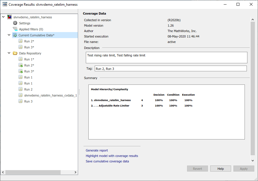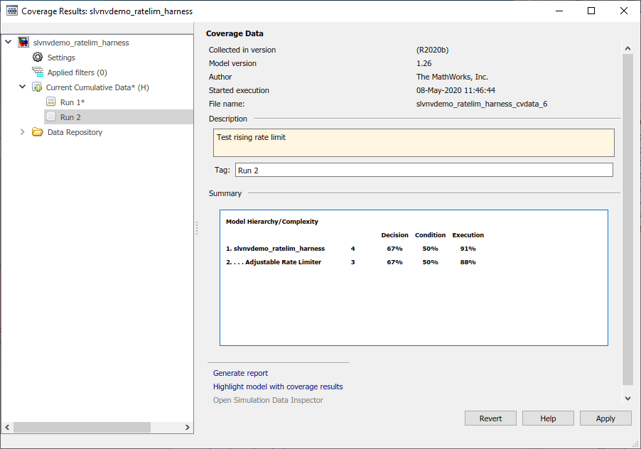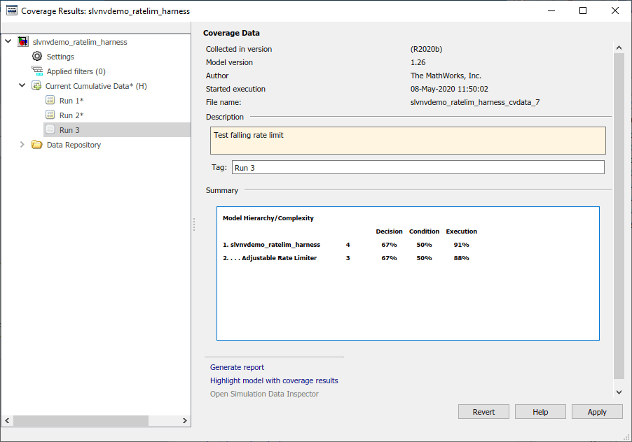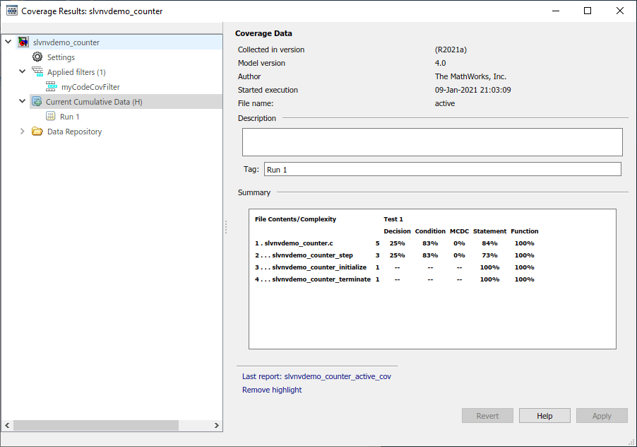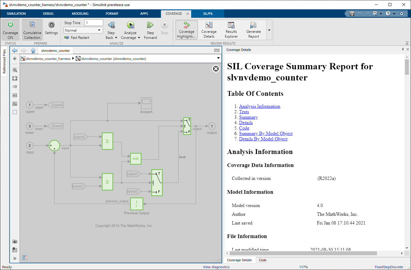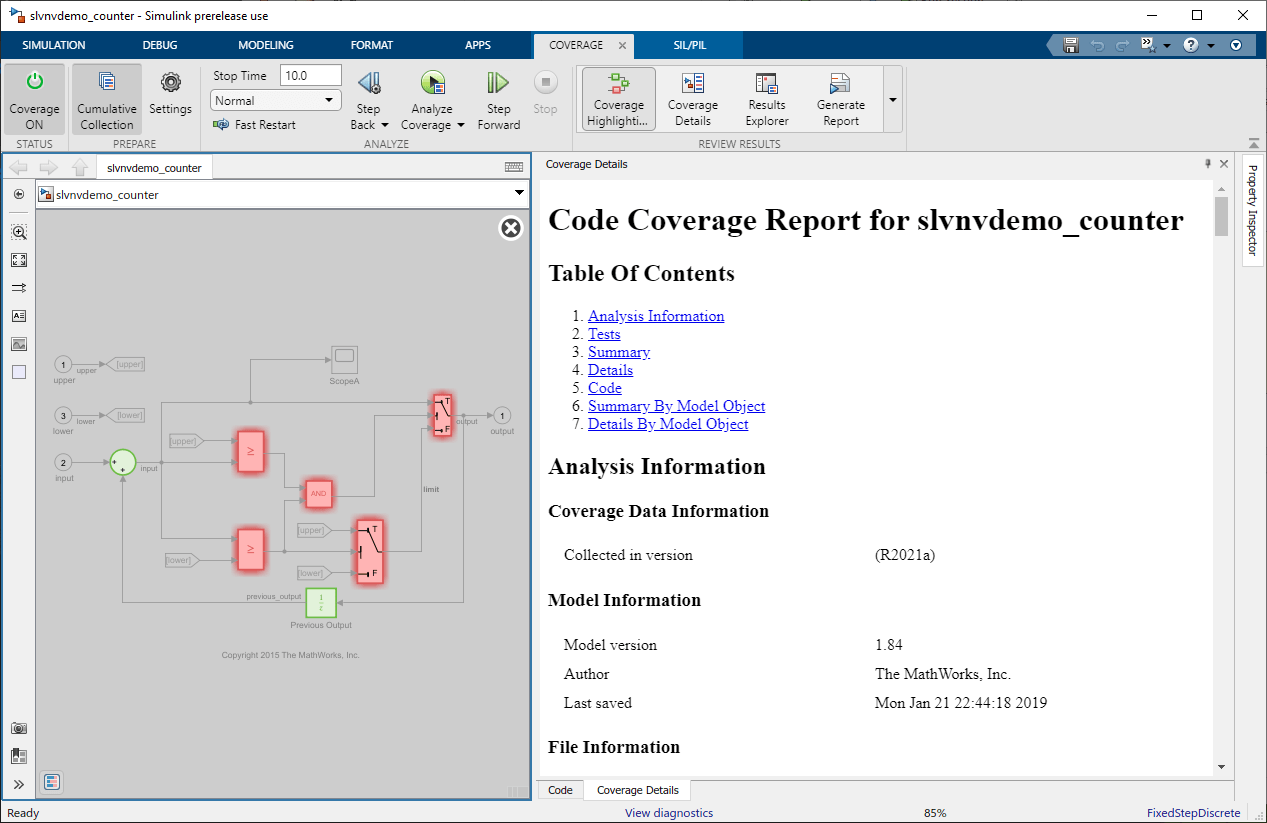 AnalyzingMCDCForCascadedLogicBlocksExample_01.png AnalyzingMCDCForCascadedLogicBlocksExample_02.png AnalyzingMCDCForCascadedLogicBlocksExample_03.png BasicOperationOfTheModelCoverageToolExample_01.png CollectCoverageForMultipleSimulationsExample_01.png CommandLineVerificationExample_01.png CommandLineVerificationExample_02.png CommandLineVerificationExample_03.png CommandLineVerificationExample_04.png CommandLineVerificationExample_05.png CoverageForMATLABFunctionBlocksExample_01.png CoverageForMATLABFunctionBlocksExample_02.png CoverageForMATLABFunctionBlocksExample_03.png CoverageForMATLABFunctionBlocksExample_04.png CoverageForMATLABFunctionBlocksExample_05.png CoverageForMATLABFunctionBlocksExample_06.png CoverageForMATLABFunctionBlocksExample_07.png CoverageForMATLABFunctionBlocksExample_08.png CoverageForMinMaxCollapseModeExample_01.png CoverageForSFunctionsExample_01.png CreateACoverageHarnessWithDefaultOptionsExample_01.png CreateACoverageHarnessWithDefaultOptionsExample_02.png CreatingAndUsingCoverageFiltersExample_01.png CumulativeCoverageAnalysisExample_01.png CumulativeCoverageAnalysisExample_02.png ExCcCruiseControlDoublepressSfunExample_01.png ExploreModelAndCodeCoverageDifferencesExample_01.png ExploreModelAndCodeCoverageDifferencesExample_02.png ExploreModelAndCodeCoverageDifferencesExample_03.png ExploreModelAndCodeCoverageDifferencesExample_04.png ExploreModelAndCodeCoverageDifferencesExample_05.png ExtractAtomicSubsystemToNewModelExample_01.png ExtractSubchartAndCopyToANewModelExample_01.png ExtractingDetailedCoverageDataExample_01.png FilterCodeCoverageOutcomesUsingTheCodePaneExample_01.png FilterCodeCoverageOutcomesUsingTheCodePaneExample_02.png FilterCoverageOutcomesInGeneratedCodeExample_01.png LogicalOperatorCascadePatternsExample_01.png LogicalOperatorCascadePatternsExample_02.png LogicalOperatorCascadePatternsExample_03.png LogicalOperatorCascadePatternsExample_04.png LogicalOperatorCascadePatternsExample_05.png LogicalOperatorCascadePatternsExample_06.png MP_switch_aggregate.png MP_switch_integration.png MP_switch_unit.png MinMaxRelBoundCoverageExample_01.png ObtainCumulativeCoverageForReusableSubsystemsExample_01.png OperationsOnCoverageDataExample_01.png RecordCoverageInParallelSimulationsExample_01.png RecordCoverageInParallelSimulationsExample_02.png RemoveRulesFromFilterObjectsExample_01.png SaturationOnIntegerOverflowCoverageExample_01.png SoftwareintheLoopCodeCoverageExample_01.png aggregated-covTable.png aggregated_integration_and_unit_report.png aggregated_integration_tests.png aggregated_results_reports.png aggregated_unit_tests.png applied-filters-create-new.png basic_operation_2.png basic_operation_3.png basic_operation_4.png basic_operation_5.png basic_operation_6.png code-cov-report-links.png code-pane-cov-summary.png code_cov_justified_outcome.png codeselectorCoverageAfter.png collapsed-decision-results-dim2.png collapsed-decision-results.png collapsed-relbound-results-dim2.png collapsed-relbound-results.png complete-cov-function-call.png complete-cov-statement.png complete-cov-switch-label.png condition-tooltip-not-covered.png counterbusFcnIm.png cov-results-explorer-exclusion.png cov_filt.png cumulative_manual_final_explorer1.png cumulative_manual_final_explorer2.png cumulative_manual_final_explorer3.png cumulative_manual_final_report.png cumulative_manual_settings1.png cumulative_manual_t1_explorer1.png cumulative_manual_t2_explorer1.png cumulative_manual_t2_explorer2.png cumulative_manual_t2_explorer3.png cumulative_manual_t2_report.png cumulative_manual_t3_explorer1.png cumulative_manual_t3_explorer2.png cumulative_manual_t3_report.png cvLogicCascadeMcdc_MatlabFunc.png cvLogicCascadeMcdc_highlight.png cvLogicCascadeMcdc_informer.png cvLogicCascadeMcdc_report_MatlabFunc.png cvLogicCascadeMcdc_report_MatlabFunc2.png cvLogicCascadeMcdc_report_and.png cvLogicCascadeMcdc_report_and_non_sc.png cvLogicCascadeMcdc_report_or.png dockedCovRpt.png driver-results-explorer.png driver-scenario-coverage-results.png entireSystem-Summary.png exclude-decision-link.png excluded-decision.png filteredOutcome1.png filteredOutcome2.png filteredReportImage.png filteredRptSummary.png justified-condition.png metricselector_coverage_after.png metricselector_coverage_before.png model-block-sil-mode.png model-click-multiport-switch.png objectsFiltered.png operations_manual_1.png partial-cov-condition.png relBound3Scalar.png relBound3Vector.png relBoundMixedInputs.png resultsExplorer1Filter.png resultsExplorer2FilterRules.png resultsExplorerCovData.png saturation-full-coverage.png saturation-missing-coverage.png select-coverage-filter-dialog.png sfun_to_filter.png sil-code-annotations.png sil-cov-details.png sil-pil-app-cov.png sil-switch-details.png slvnvdemo-covfilter-filteredSummary.png slvnvdemo-eml-model-thumbnail.png slvnvdemo_covfilter_DeadLogic_FilterRules.png slvnvdemo_covfilter_DeadLogic_Option.png slvnvdemo_covfilter_ExcludeAfter_CovDetails.png slvnvdemo_covfilter_ExcludeAfter_FilterEditor.png slvnvdemo_covfilter_ExcludeAfter_UpdatedModel.png slvnvdemo_covfilter_ExcludeBefore_ContextMenu.png slvnvdemo_covfilter_ExcludeBefore_FilterEditor_Named.png slvnvdemo_covfilter_ExcludeBefore_FilterEditor_Untitled.png slvnvdemo_covfilter_FinalReview_CovDetails_Summary.png slvnvdemo_covfilter_JustifyOutcomes_FilterEditor.png slvnvdemo_covfilter_JustifyOutcomes_ModelAfter.png slvnvdemo_covfilter_JustifyOutcomes_ModelBefore.png slvnvdemo_covfilter_LoadFilter_Option.png slvnvdemo_covfilter_LoadFilter_UpdatedFilterList.png slvnvdemo_covfilter_NewFilter_Named.png slvnvdemo_covfilter_NewFilter_Option.png slvnvdemo_covfilter_Simulate_HighlightedModel.png stacked-annotations-condition-2.png stacked-annotations-condition-justified.png stacked-annotations-decision.png stacked-annotations.png subsys1-covTable.png subsys2-covTable.png sum-block-params-saturation.png two-scenario-coverage-results.png two-scenario-results-explorer.png unfilteredRpt.png xxMP_switch_aggregate.png xxMP_swi