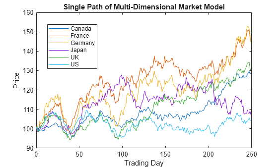 plot(T, S), xlabel('Trading Day'), ylabel('Price') title('Single Path of Multi-Dimensional Market Model') legend({'Canada' 'France' 'Germany' 'Japan' 'UK' 'US'}, ... 'Location', 'Best')