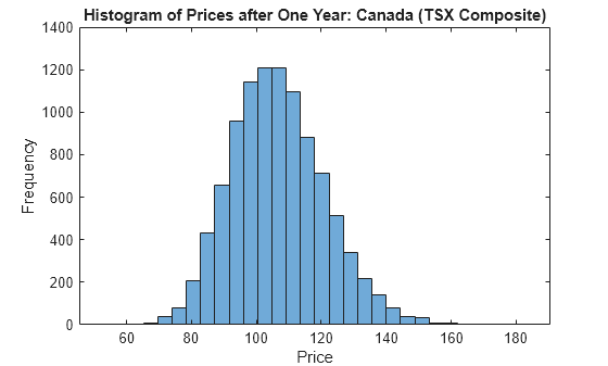 Figure contains an axes object. The axes object with title Histogram of Prices after One Year: Canada (TSX Composite), xlabel Price, ylabel Frequency contains an object of type histogram.