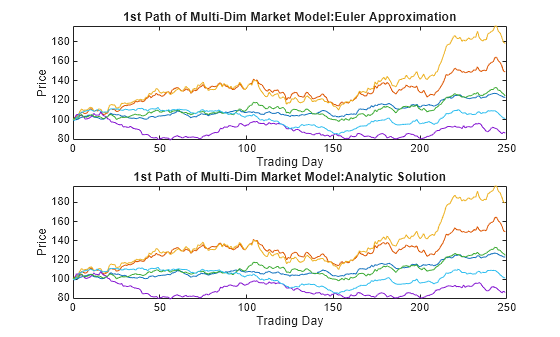 Figure contains 2 axes objects. Axes object 1 with title 1st Path of Multi-Dim Market Model:Euler Approximation, xlabel Trading Day, ylabel Price contains 6 objects of type line. Axes object 2 with title 1st Path of Multi-Dim Market Model:Analytic Solution, xlabel Trading Day, ylabel Price contains 6 objects of type line.