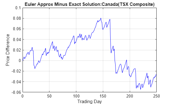 Figure contains an axes object. The axes object with title Euler Approx Minus Exact Solution:Canada(TSX Composite), xlabel Trading Day, ylabel Price Difference contains an object of type line.