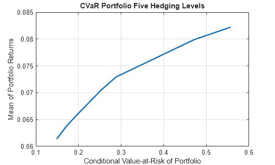 p = PortfolioCVaR('Name','CVaR Portfolio Five Hedging Levels',... 'AssetList',{'Stock','Hedge50','Hedge75','Hedge90','Hedge95'},... 'Scenarios', AssetScenarios, 'LowerBound', 0, ... 'Budget', 1, 'ProbabilityLevel', 0.95); % Estimate the efficient frontier to obtain portfolio weights pwgt = estimateFrontier(p); % Plot the efficient frontier figure; plotFrontier(p, pwgt);