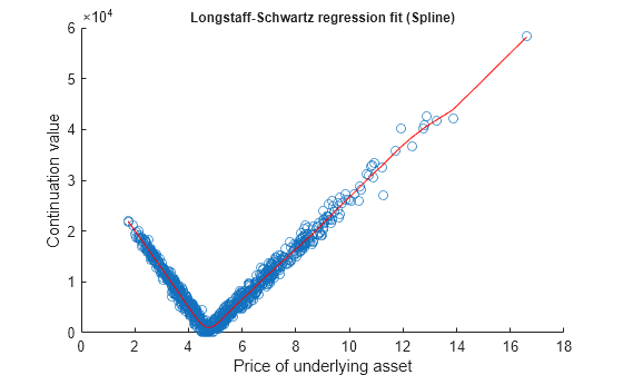 Figure contains an axes object. The axes object with title Longstaff-Schwartz regression fit (Spline), xlabel Price of underlying asset, ylabel Continuation value contains 2 objects of type scatter, line.