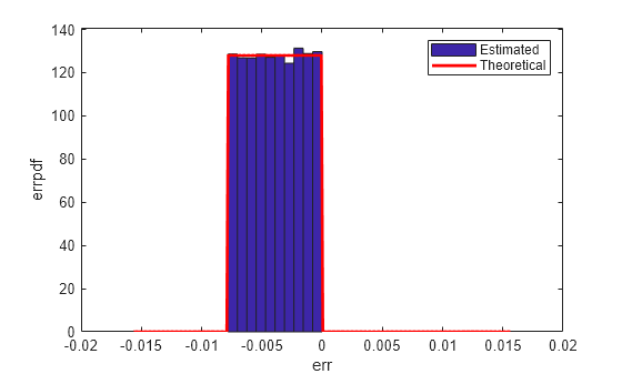 The theoretical probability density function of the quantization error is computed with the errpdf function, the theoretical mean of the quantization error is computed with the errmean function, and the theoretical variance of the quantization error is computed with the errvar function.