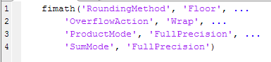 4. To insert the fimath object constructor in your file, place your cursor at the desired location in the file. Then click OK on the Insert fimath Constructor dialog box. Clicking OK closes the Insert fimath Constructor dialog box and automatically populates the fimath object constructor in your file: