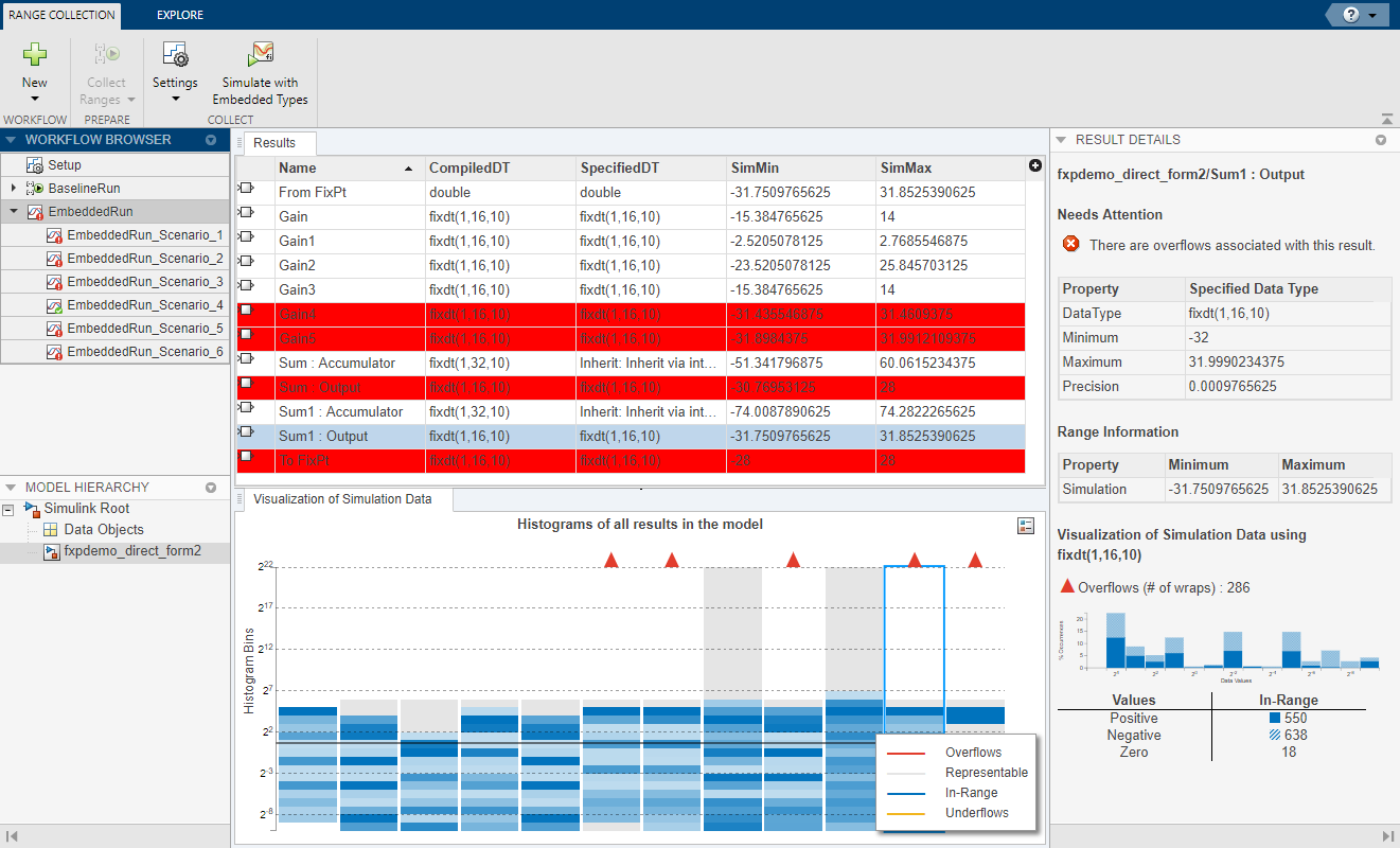 EmbeddedRunresults with overflows and sorts the list based on block execution order. In this example, the first overflow occurs in the Gain4 block.You can double-click any row in the Results spreadsheet to highlight the block in the model.
