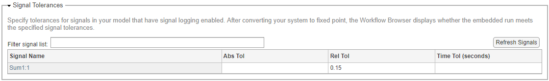 Simulink.SimulationInputobject,simIn, that you defined in the base workspace.To specify tolerances for the system, under Signal Tolerances, specify tolerances for any signal in the model with signal logging enabled.