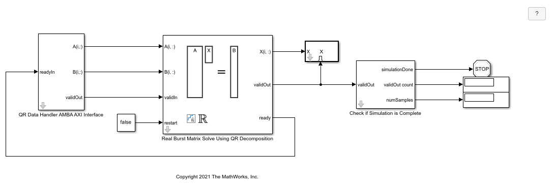 The Real Burst Matrix Solve Using QR Decomposition block outputs data one row at a time. When a result row is output, the block sets validOut to true. The rows of X are output in the order they are computed, last row first, so you must reconstruct the data to interpret the results. To reconstruct the matrix X from the output data, use the helper function matrixSolveModelOutputToArray.