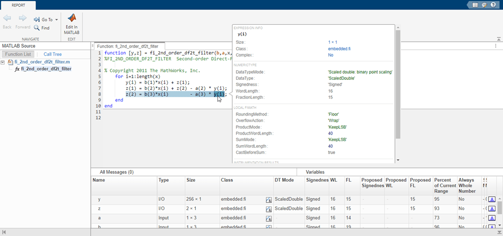 Hover over expressions or variables in the instrumented code generation report to see the simulation minimum and maximum values. In this design, the inputs fall between -1 and +1, and the values of all variables and intermediate results also fall between -1 and +1. This suggests that the data types can all be fractional (fraction length one bit less than the word length). However, this will not always be true for this function for other kinds of inputs and it is important to test many types of inputs before setting final fixed-point data types.