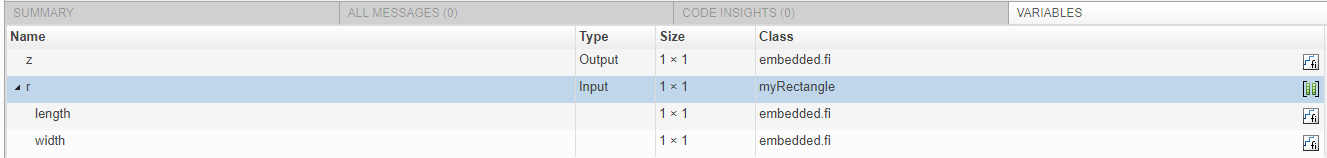 t = coder.ClassType 1×1 myRectangle length: 1×1 embedded.fi DataTypeMode: Fixed-point: binary point scaling Signedness: Signed WordLength: 16 FractionLength: 12 width : 1×1 embedded.fi DataTypeMode: Fixed-point: binary point scaling Signedness: Signed WordLength: 16 FractionLength: 12Pass the type to