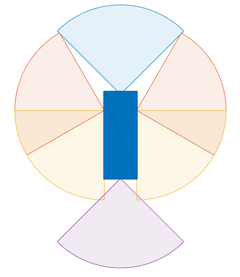 The ego vehicle is equipped with 6 homogeneous lidars, each with a horizontal field of view of 90 degrees and a vertical field of view of 40 degrees. The lidars are simulated using the lidarPointCloudGenerator (Automated Driving Toolbox) System object. Each lidar has 32 elevation channels and has a resolution of 0.16 degrees in azimuth. Under this configuration, each lidar sensor outputs approximately 18,000 points per scan. The configuration of each sensor is shown here.