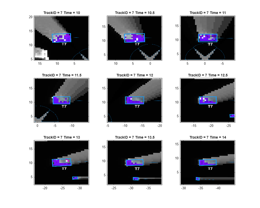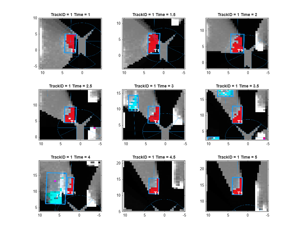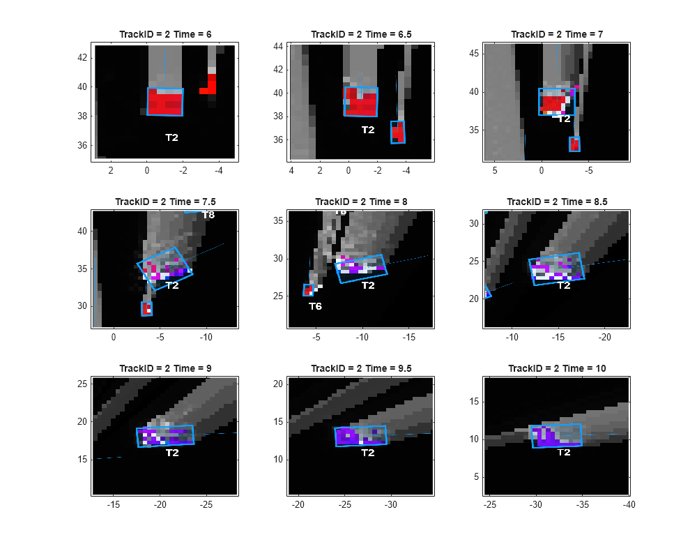 In this example, you used a "constant-velocity" model with the tracker. This motion model assumes that the targets move at a constant velocity, meaning constant speed and direction. However, in urban scenes, this assumption is usually not accurate. To compensate for the unknown acceleration of the objects, a process noise is specified on the tracker. The following snapshots show the history of track T2. This track represents the vehicle directly in front of the ego vehicle. Notice in the ground truth that this vehicle turns right at the intersection.