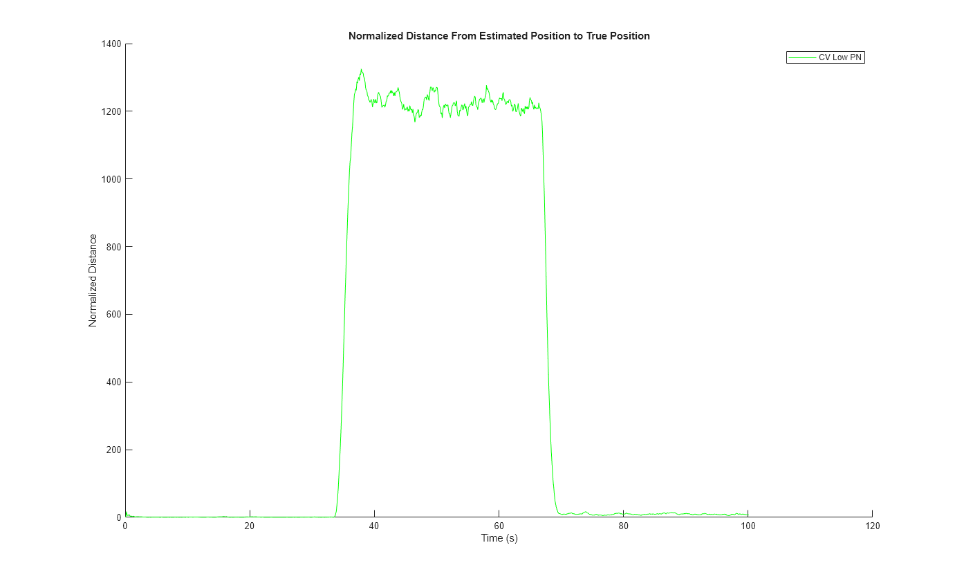 Increasing the process noise significantly improves the filter's ability to track the target during the turn. However, there is a cost: the filter is less capable of smoothing out the measurement noise during the constant velocity period of the motion. Even though the normalized distance during the turn was significantly reduced, the normalized distance increased in the first 33 seconds, during the constant velocity period of the motion.