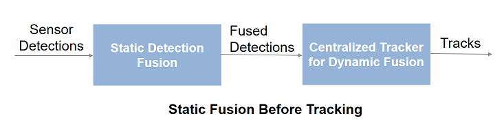 This example demonstrates the use of the Static Fusion Before Tracking [1] architecture for tracking using passive measurements. The Static Fusion part of the architecture aims to triangulate the most likely set of detections and output fused detections containing estimated positions of targets. As measurements need to be fused together by static fusion, the sensors must report measurements synchronously.