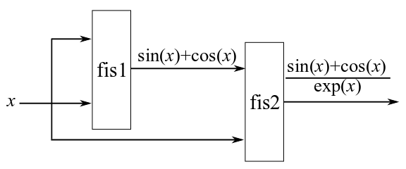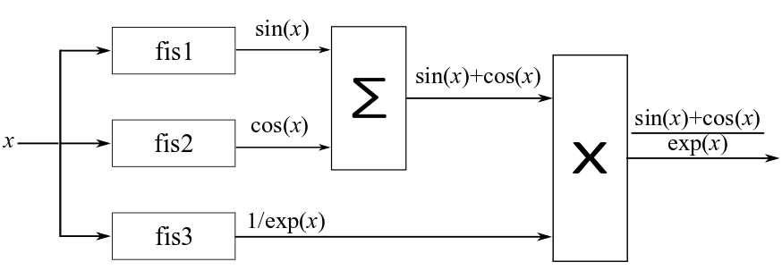 As an example, suppose that you want to create a FIS tree for approximating the function . You could implement a FIS tree that models all of the mathematical operations using component FIS objects, as shown in an example in tunefis.