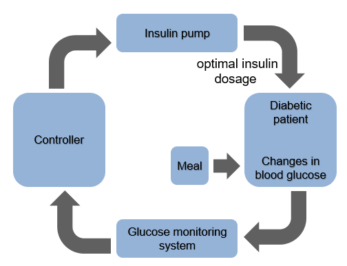 The following figure, which is adapted from [1], shows the components of an artificial pancreas system.