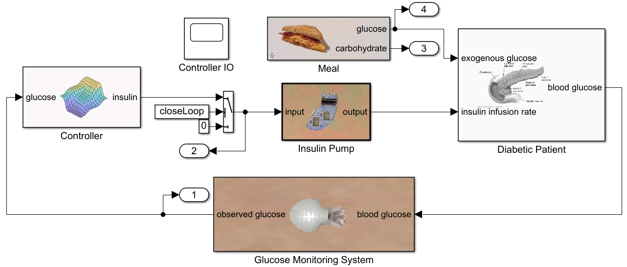 The artificialPancreasWithFISTreeControl Simulink® model implements an artificial pancreas system.