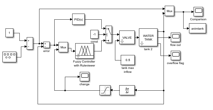 For this example, you control the level of water in a tank using a fuzzy inference system implemented using a Fuzzy Logic Controller block. Open the sltank model.
