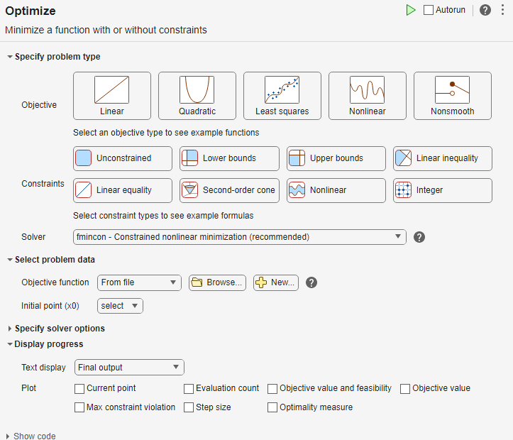 patternsearch.In the Select problem data section of the task, select Objective function > Function handle and then choose