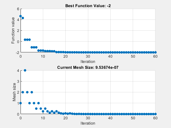 The lower plot shows the mesh size at each iteration. The mesh size increases after each successful iteration and decreases after each unsuccessful iteration. For details, see How Pattern Search Polling Works.