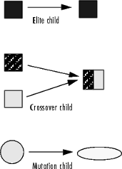 An elite child is identical to its parent. A crossover child gets some of each parent. A mutation child comes from one parent, and includes a change.