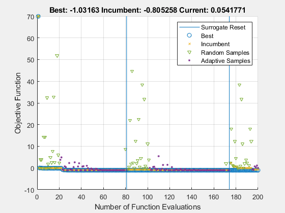 Figure Optimization Plot Function contains an axes object. The axes object with title Best: -1.03163 Incumbent: -0.805258 Current: 0.0541771, xlabel Number of Function Evaluations, ylabel Objective Function contains 6 objects of type line. One or more of the lines displays its values using only markers These objects represent Best, Incumbent, Random Samples, Adaptive Samples, Surrogate Reset.