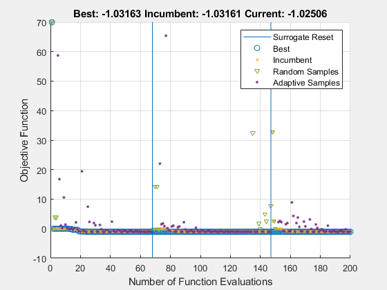 Figure Optimization Plot Function contains an axes object. The axes object with title Best: -1.03163 Incumbent: Inf Current: -1.0313, xlabel Number of Function Evaluations, ylabel Objective Function contains 6 objects of type line. One or more of the lines displays its values using only markers These objects represent Best, Incumbent, Random Samples, Adaptive Samples, Surrogate Reset.