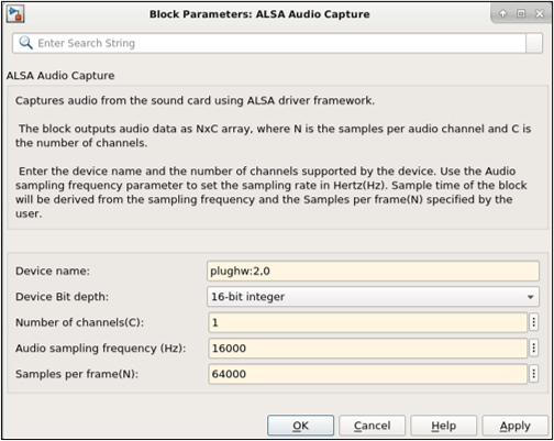 To use the microphone connected to the target to capture real-time audio, double-click the NVIDIA ALSA Audio Capture block to set the block parameters. Set the Device name, Device Bit depth, Number of channels (C), Audio sampling frequency, and Samples per frame(N) of the outgoing audio data.