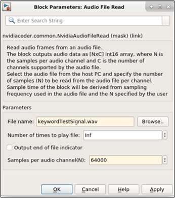 To use prerecorded audio, double-click the NVIDIA Audio File Read block to set the block parameters. Set the File name, Samples per audio channel (N) of the outgoing audio data. The value of Samples per audio channel must be equal to the value of Samples per frame parameter of the NVIDIA ALSA Audio Capture block.